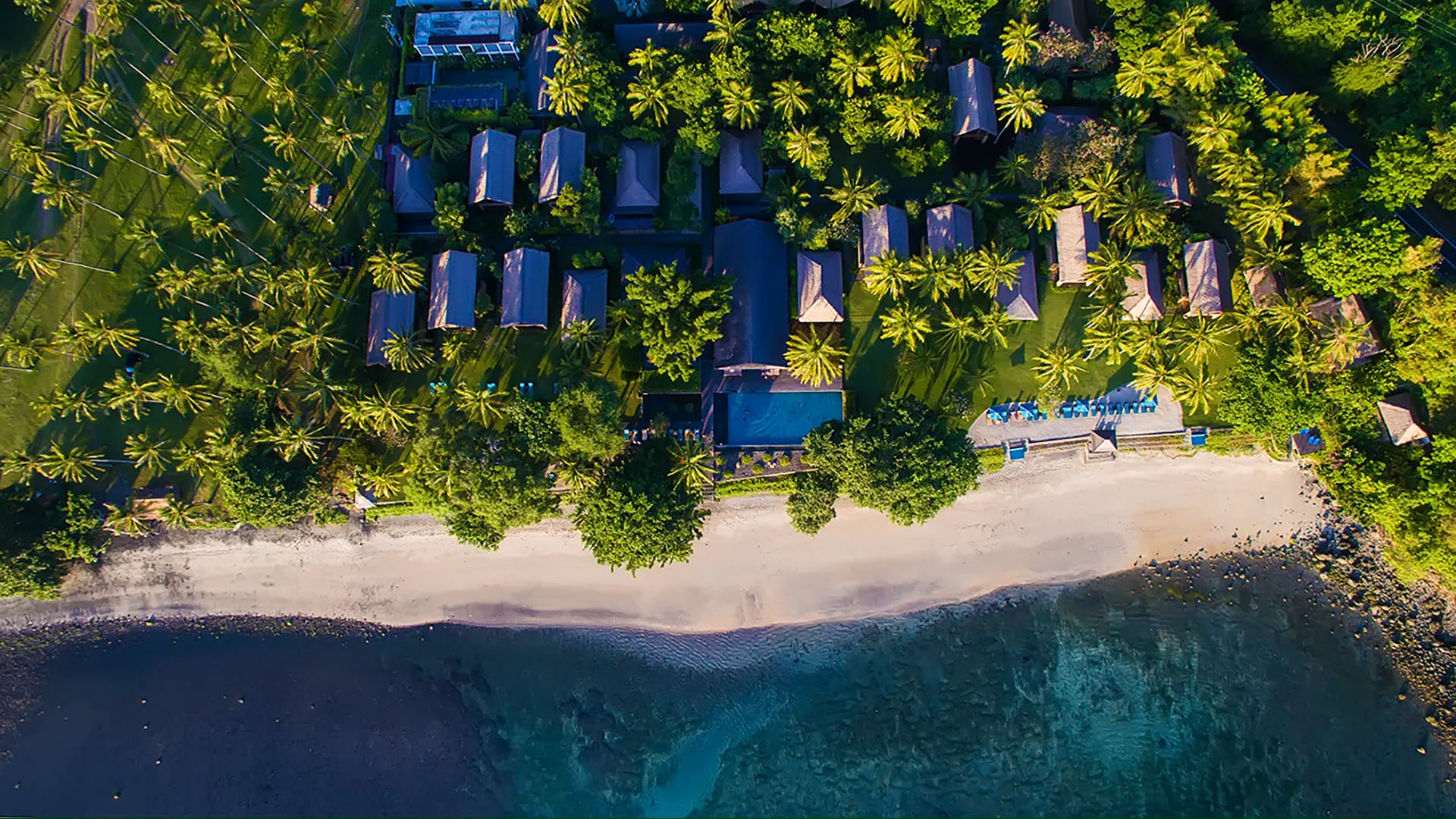 Resortets villaer ligger spredt i en stor tropisk have, fyldt med farvestrålende blomster, der strækker sig til stranden. Små stier snor sig gennem haven og forbinder de to pools med det privat strandområde. Herfra kan l nyde solnedgangen over Bali, men I får en eftermiddagsdrink i strandbaren, inden I finder aftenens restaurant. Der er flere restauranter på hotellet hvis I ikke vil til byen, som er en kort gå-tur væk. I kan slappe med med spa-behandlinger, yoga på stranden eller vandsport. Her er også et mindre fitnesslokale.