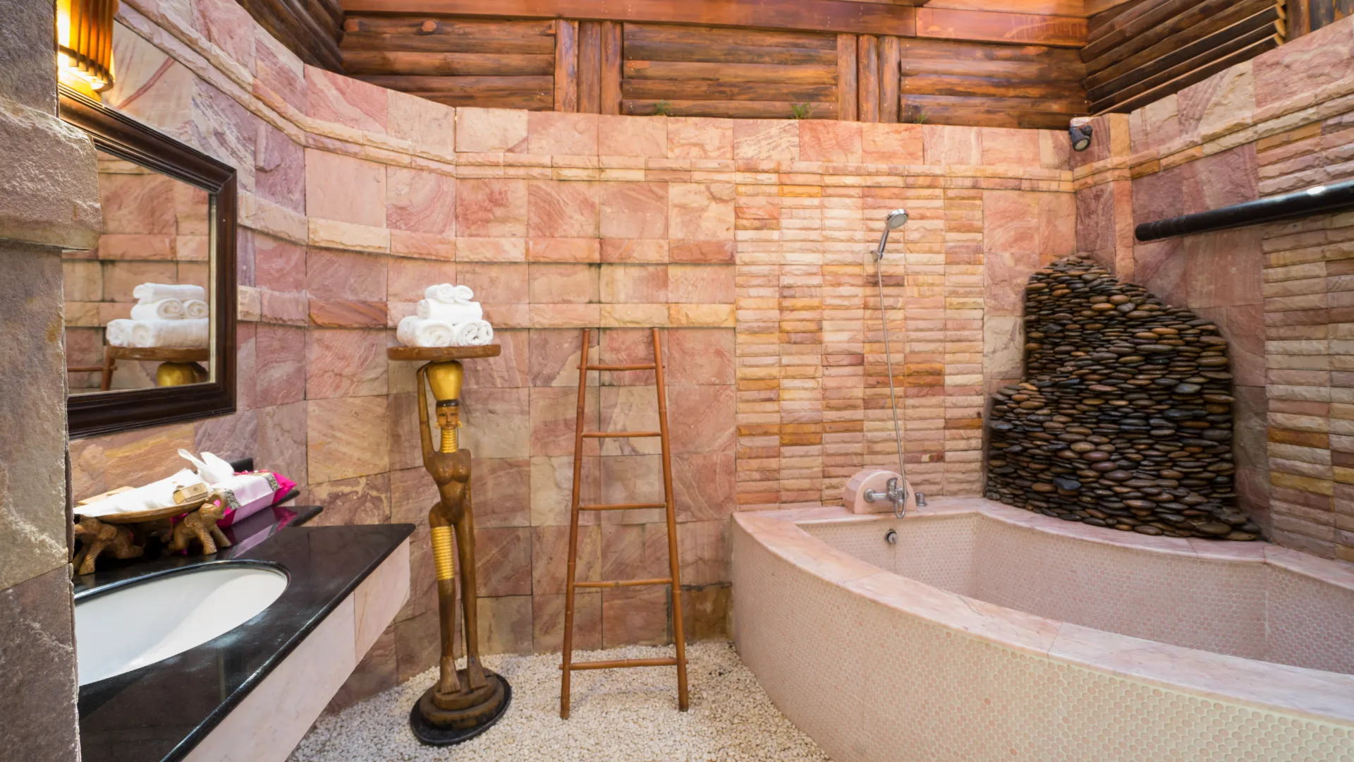 Her er 50 suiter og villaer, alle smukt møbleret med håndlavede træmøbler, delvis åbne badeværelser i ”back-to-nature stil” og rummelige terrasser. Desuden er der aircondition, kaffe/te faciliteter, minibar og safety boks.