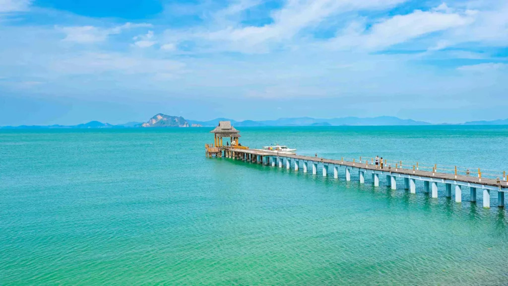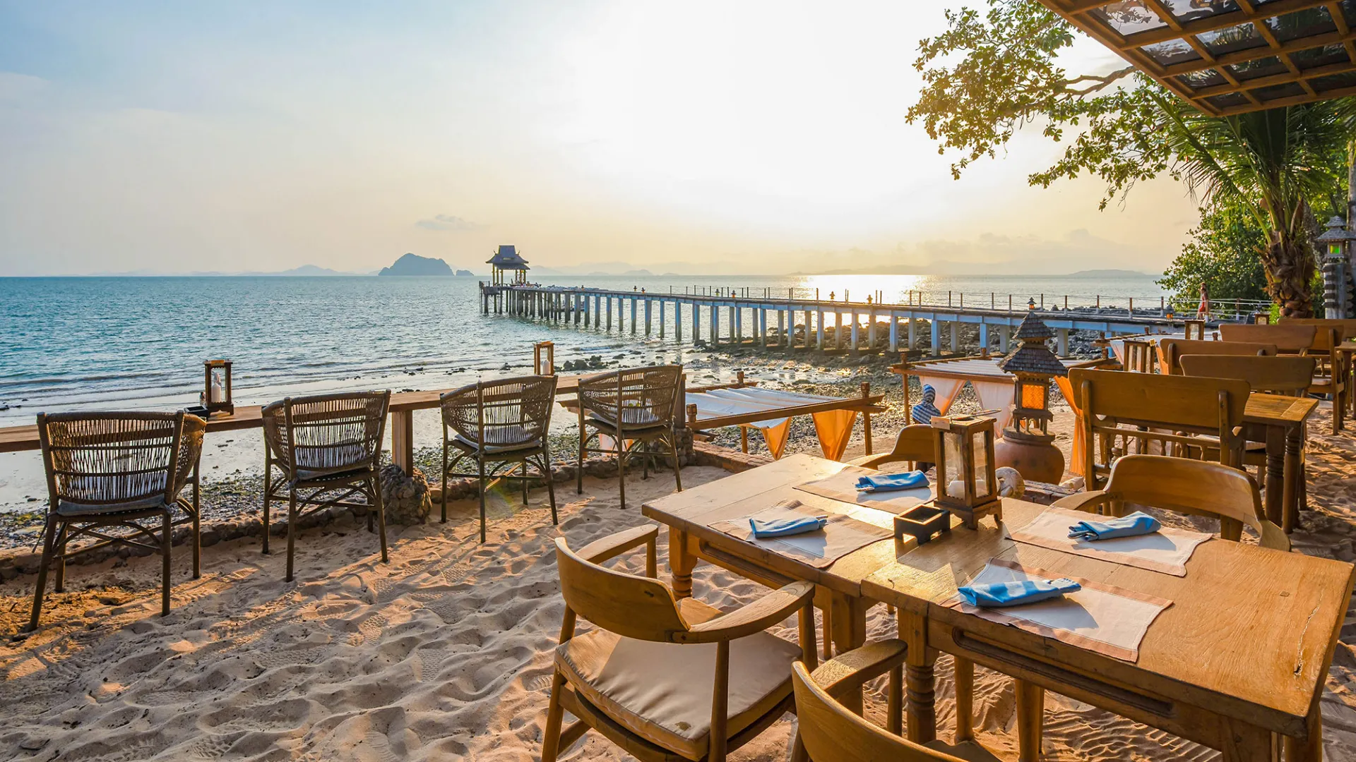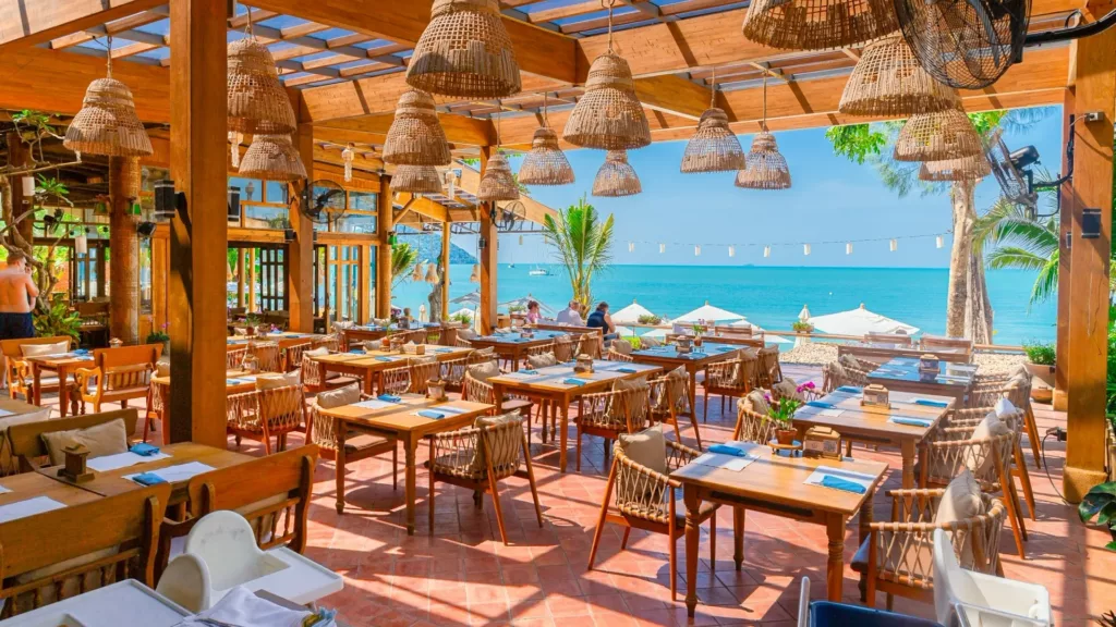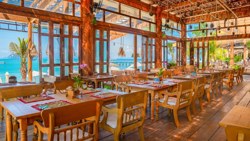 Langs stranden findes et par små lokale restauranter og et mindre super-marked. Resortet har 6 gode restauranter, der serverer lækre retter. Morgenmaden serveres med udsigt over bugten på klipperne. Ankommer I fra Phuket, er der 25 min. speedbåd transfer direkte til resortet.
