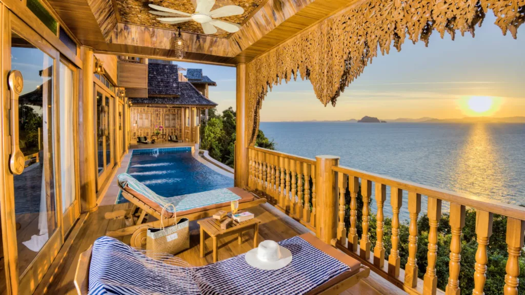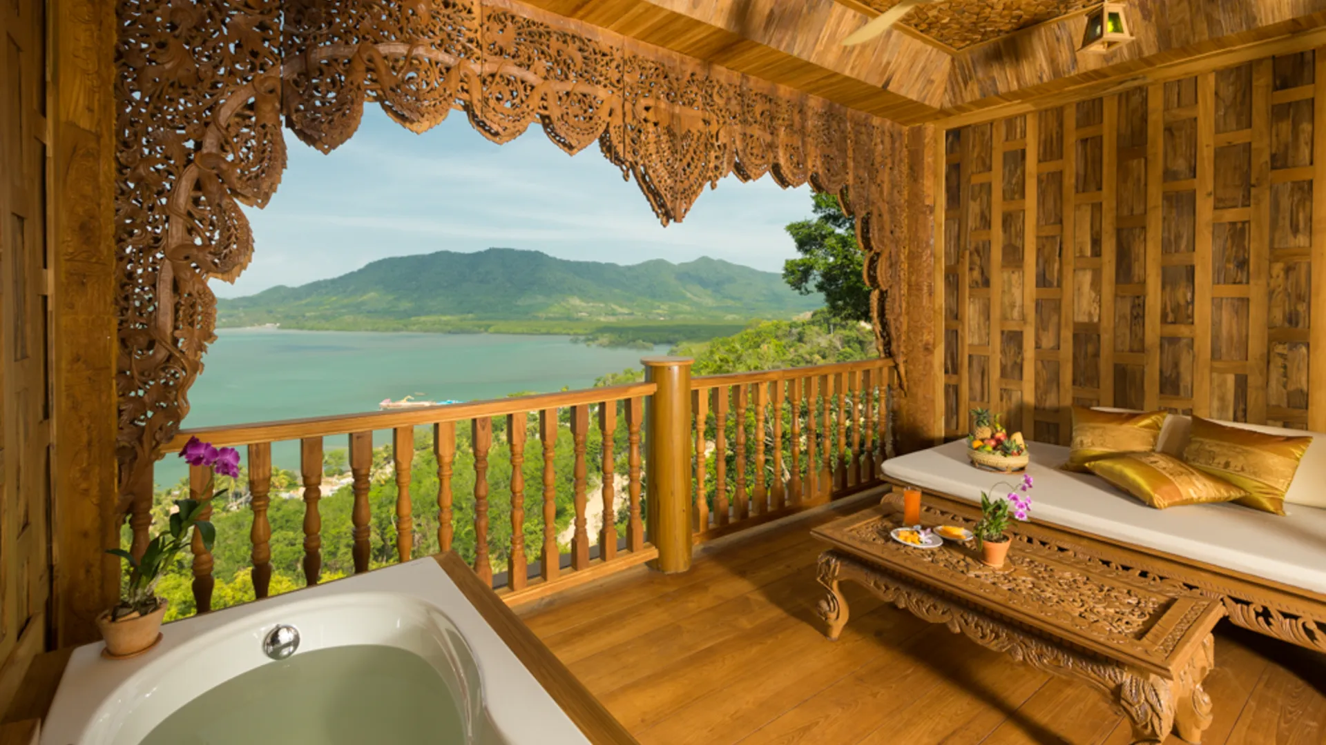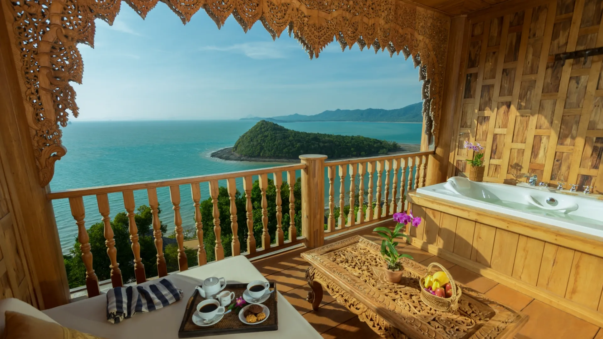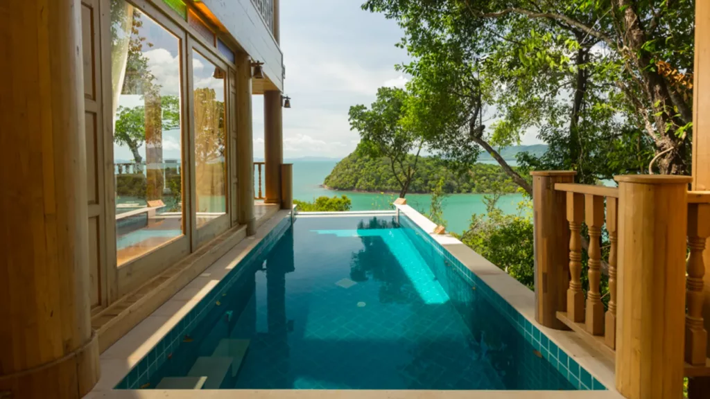 Resortet strækker sig fra stranden og over klipperne i alt 1500 m, og I kan vælge mellem smukke værelser eller enorme villaer med private pools og stor terrasse. Fra alle værelser og villaer er der en fantastisk udsigt over Phang-Nga bugten, og privatliv på balkonen eller terrassen. Værelserne er med badekar på terrassen. Alle værelser og villaer er lavet i teaktræ, og alle steder afspejles Thailands natur og kultur.