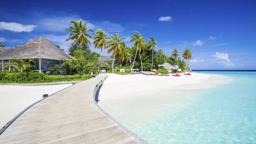 Turen med vandfly tager ca. 30 min., og undervejs kan I nyde udsigten fra 1 km højde. Det krystalblå hav og de smukke atoller følger jer hele vejen. Ved ankomst møder I en smuk, lille ø med kridhvidt sand og palmer langs stranden. Smid skoene og pust ud så er ferien virkelig i gang.