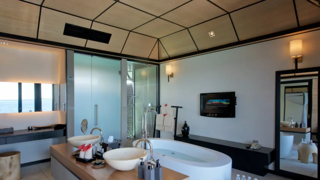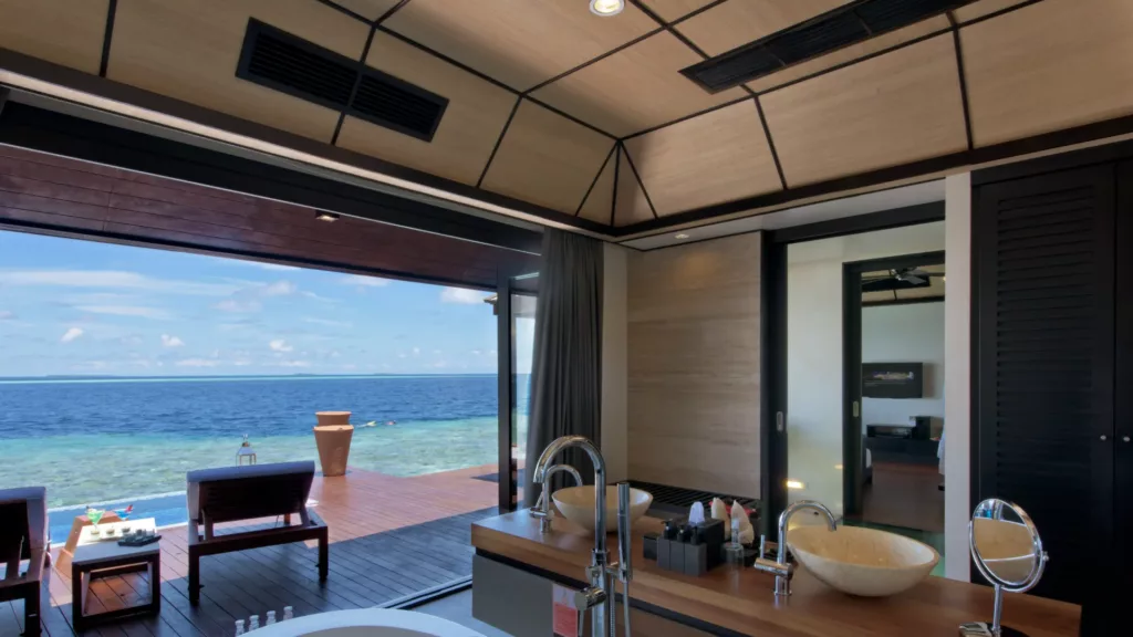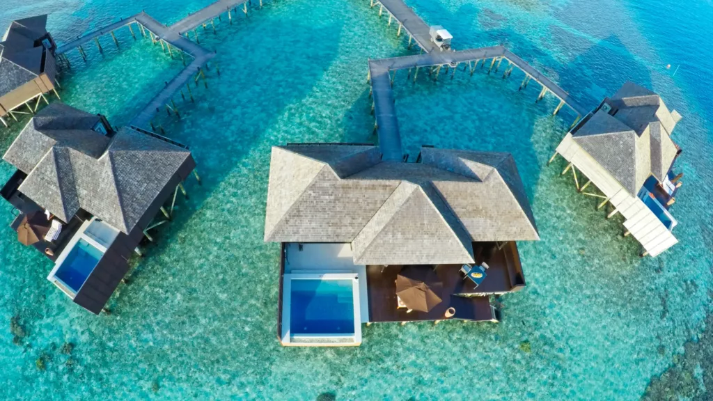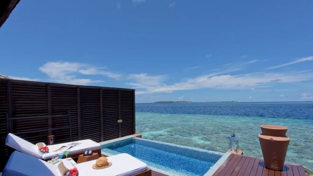 Deluxe water villaer på 126 kvm, på pæle og med direkte adgang til revet. Super-lækre med privat pool.