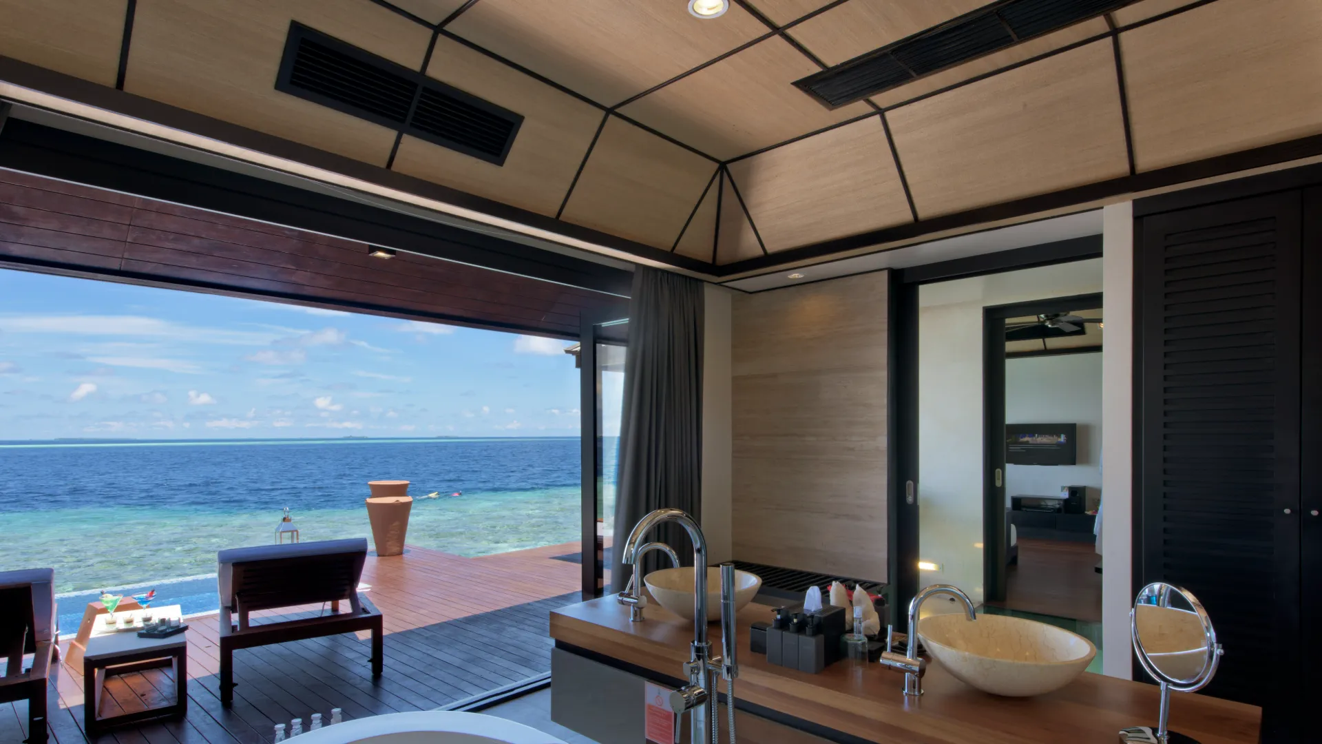 Lagoon villaer på 90 kvm med direkte adgang til havet. Med stort udendørs badeværelse med jacuzzi (vær obs på bølgerne kan "larme" ind imellem i disse villaer)