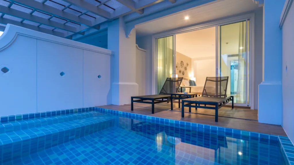 Her er flere typer af suiter I kan vælge mellem. Emerald og silver suiter i haven eller på 1. sal, gold suiter i stueplan med direkte adgang til pool fra terrassen. Platinum suiter er med stue og 2 soveværelser og diamond villaer er kun for voksne.