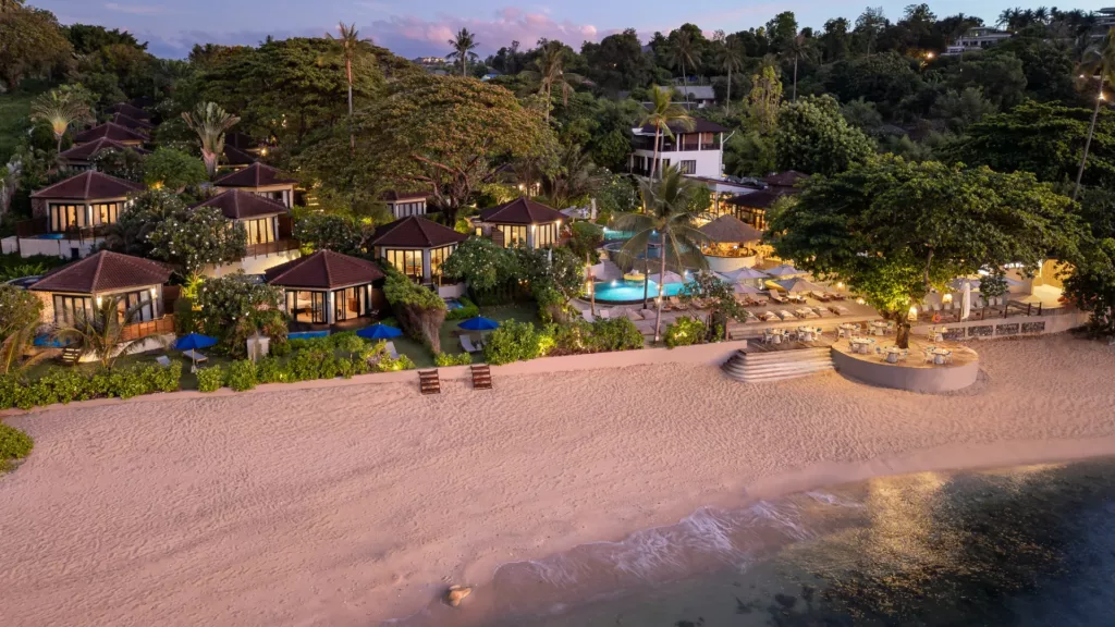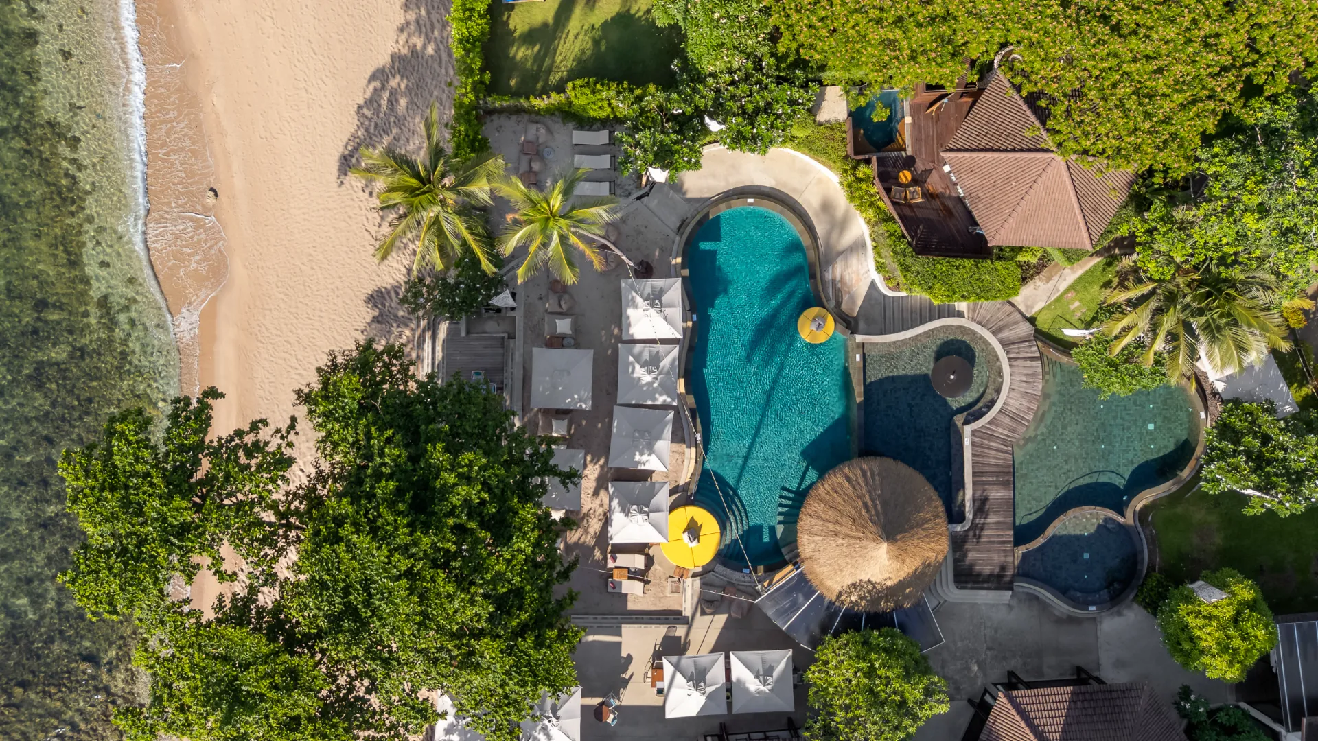 Resortet strækker sig fra den private strand op ad klipperne, og værelser og villaer ligger spredt i den smukke tropiske have. Alt er velholdt og smukt i lækre materialer, der falder naturligt ind i naturen. Her kan I nyde fantastisk service og en ro, der alle steder skinner igennem. Dagene kan bruges med yoga på stranden, fitness, vandsport som f.eks. havkajak og paddleboards samt kokkeskole. Ved stranden ligger en skøn pool med vandfald og små bassiner mellem klipperne, samt ”salaer”, hvor I kan nyde en dejlig massage med bølgeskvulp som baggrund.